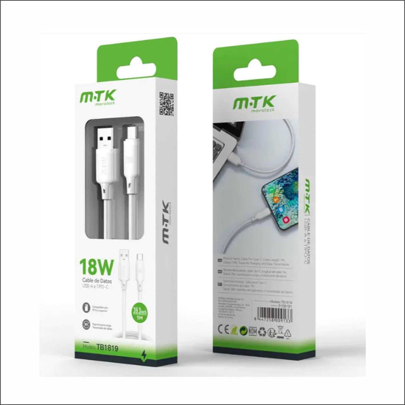 datos USB A a USB C de 18W,para carga rápida, 1 metro, Blanco, para
