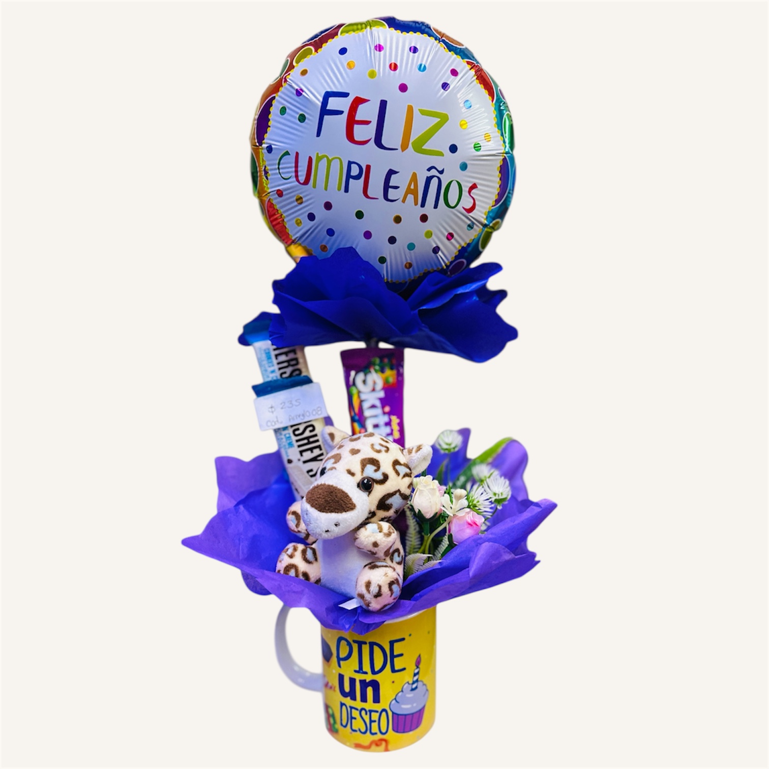 Arreglo con taza + dulces y chocolates + globo 9 pulgadas y peluche de llavero
