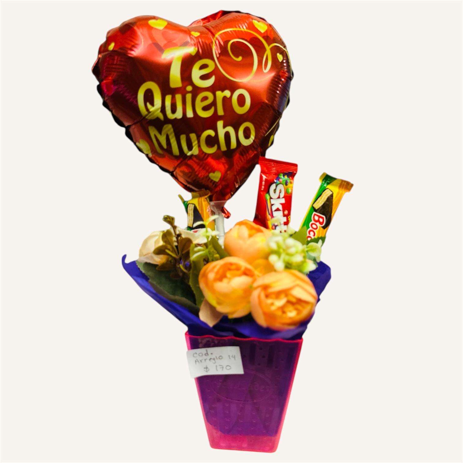 Arreglo con base plastico + chocolates con flores + 1 globo 9 pulg